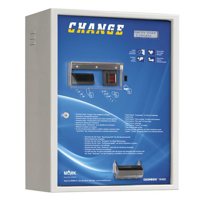 Il Cambiamonete MARK W400 è una macchina cambia-denaro progettata per l’installazione a parete o su base a pavimento, specificamente pensata per l’utilizzo in ambienti self-service come lavanderie automatiche, spazi pubblici e aree non presidiate.