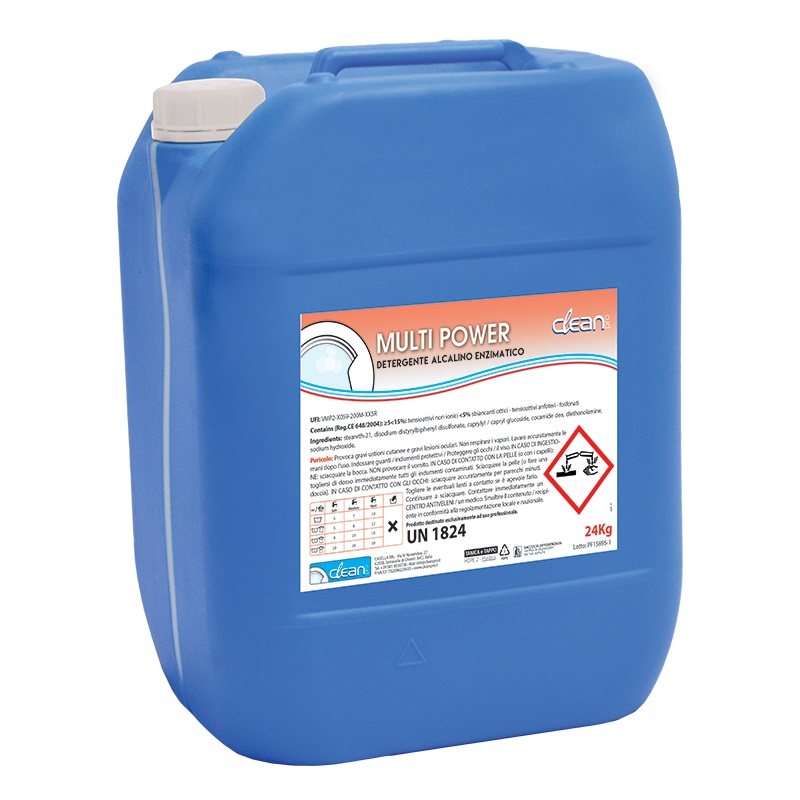 Multi Power Clean Pro 24 Kg – Detergente enzimatico alcalino ad alta concentrazione con potere sgrassante, emulsionante e candeggiante ottico per tessuti molto sporchi.