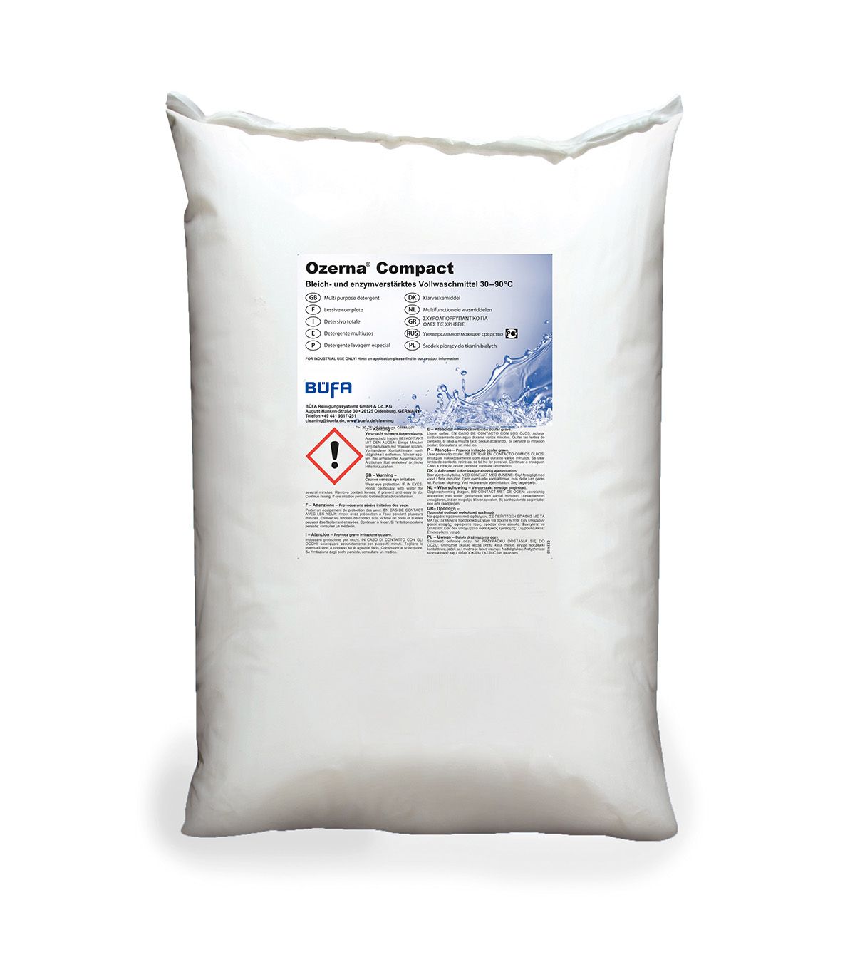 Ozerna Compact di BUFA è un detersivo in polvere ad alta concentrazione con sbiancanti ed enzimi. Ideale per biancheria professionale e capi molto sporchi.