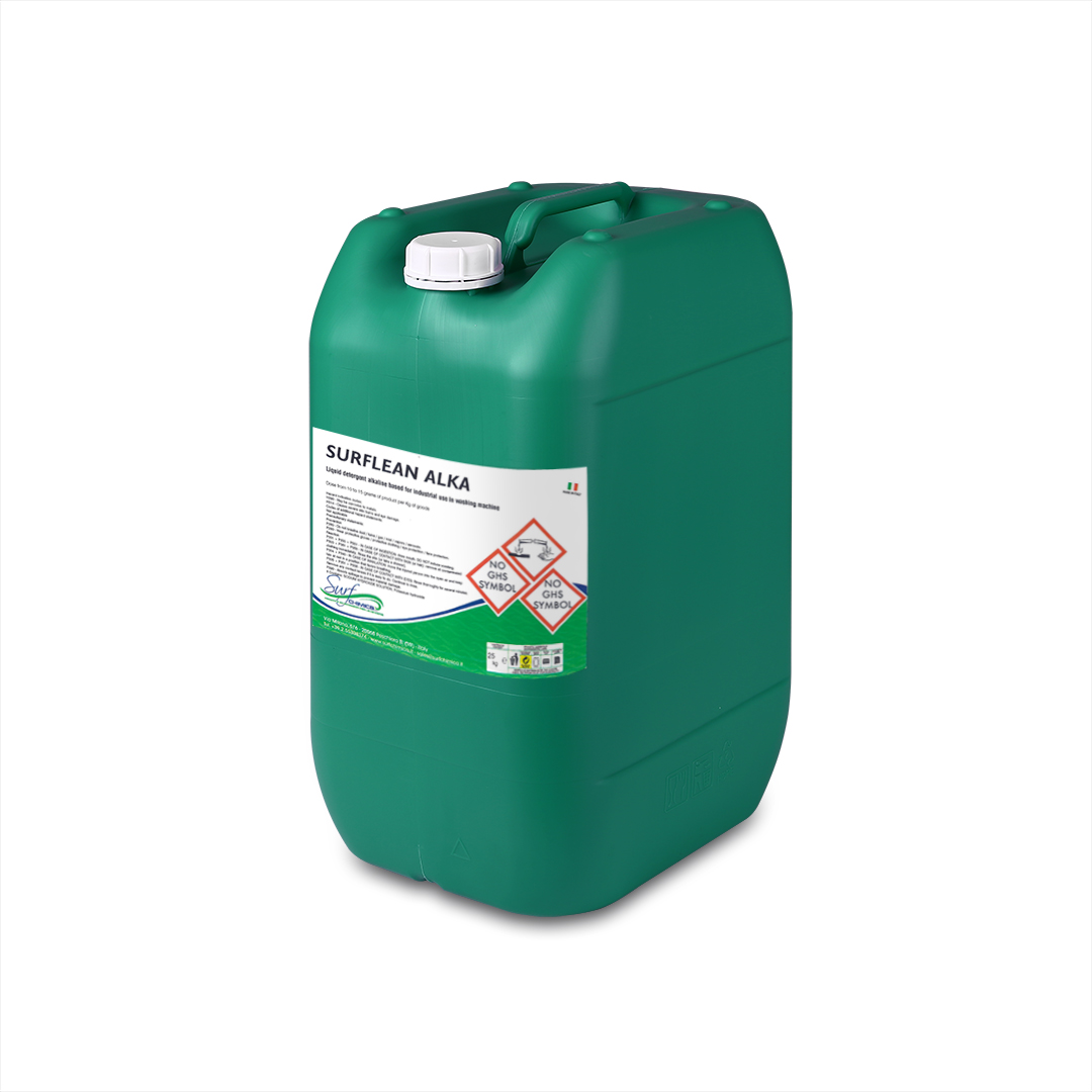 Surflean Alka: detergente alcalino liquido per lavaggio industriale. pH 14, sgrassante, non schiumogeno. Efficace da 60 °C. Acquista su Lavanderia Store.